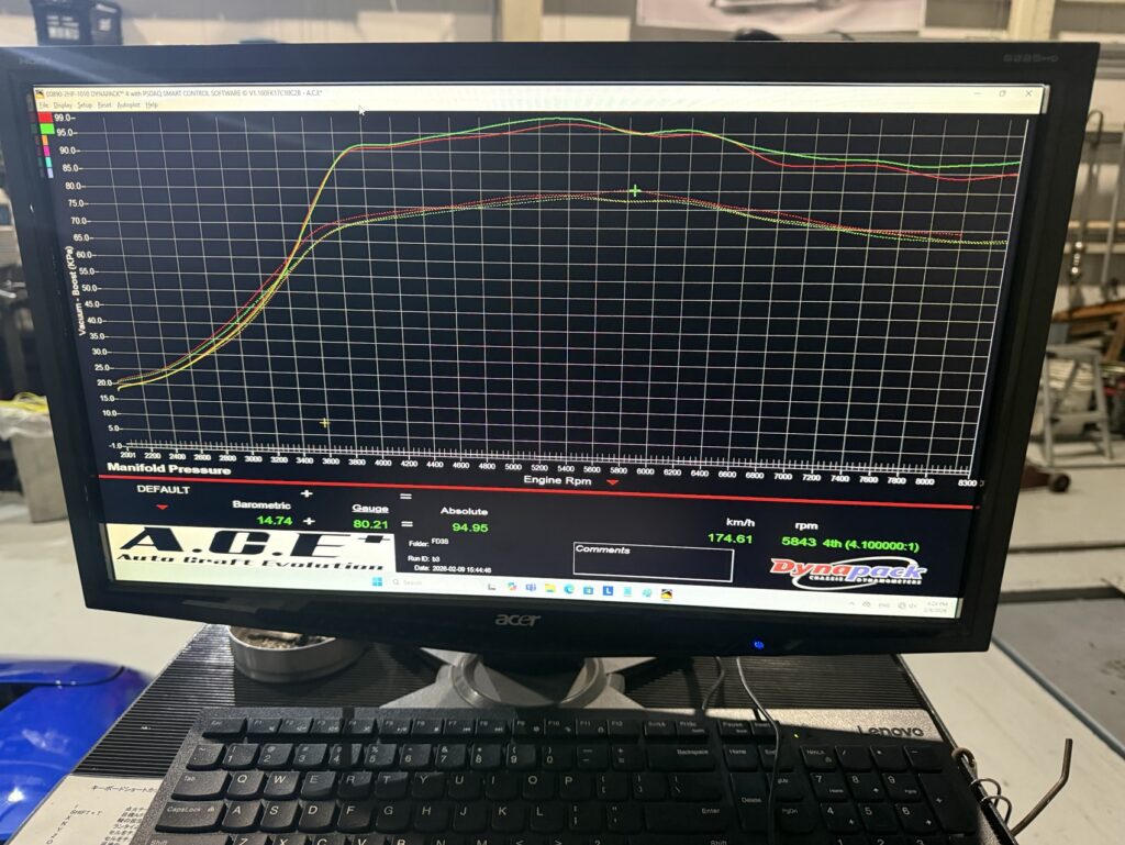 エンジンの保護を目的に今回は高回転領域ではブーストを下げ気味にし、マックスブースト0.95kPaの0.90kPaあたりで落ち着かせダイナパックを回していき最終