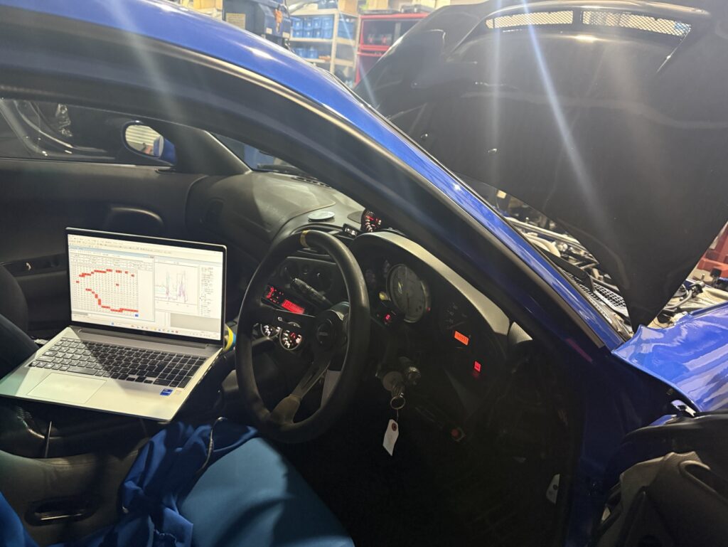 ストレートマフラーを入れるとおそらくもっとパワーは上がるのですが、今回のご依頼はビークパワーを求めてらっしゃる方では無かったのとインジェクターサイズも大きくないのでビークパワーの制限があったので、今回は超控えめにセットアップしました。