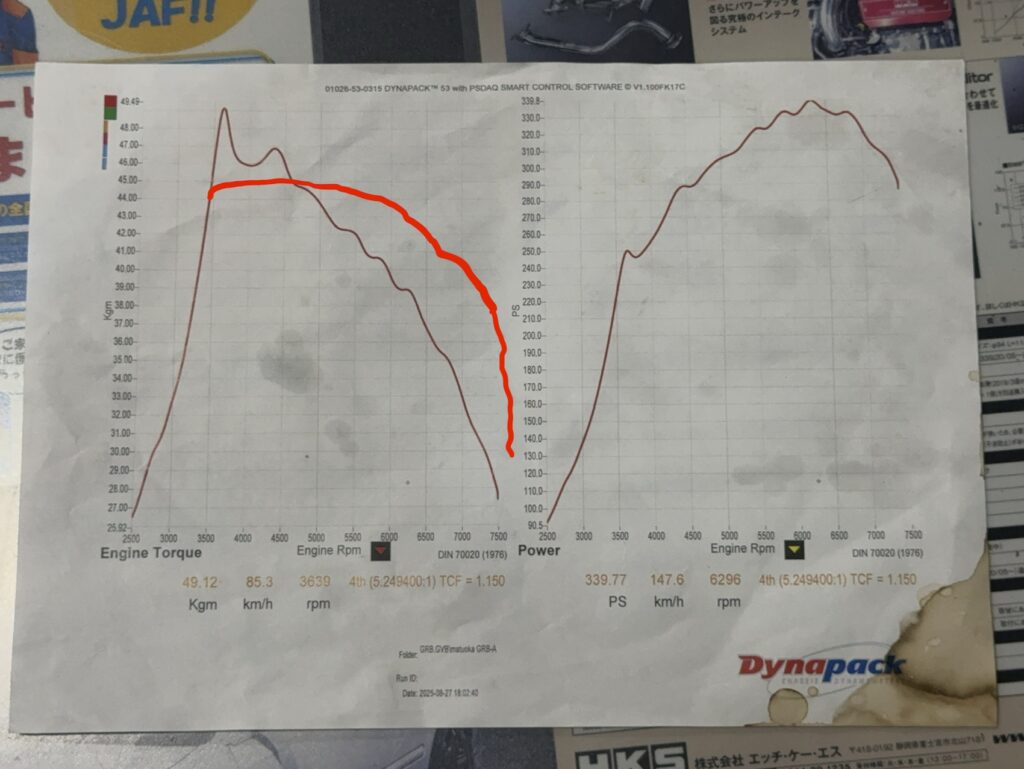 もう少し時間かけてセッティングすればこのギコギコしたグラフを綺麗にしてあげれば良かったのになーと思いつつインターセプトあたりのブースト圧も少しシュート気味だし、7000rpm以降のトルク落ち込みも早いので改善の余地はありそうに思いました。