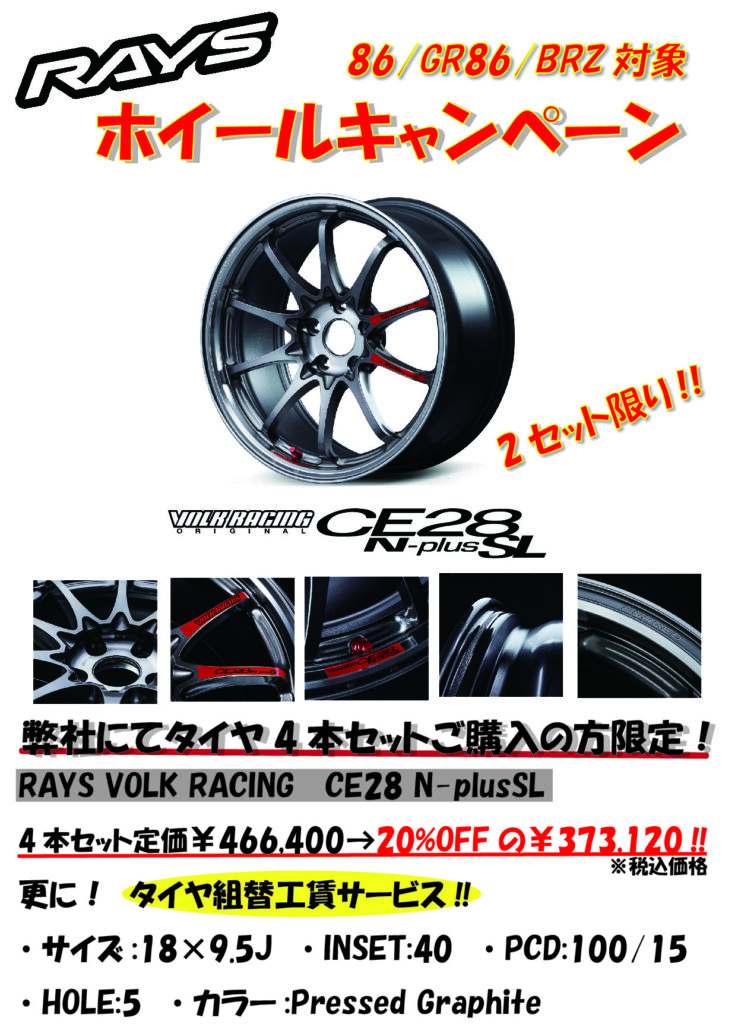 RAYS ホイールキャンペーンのお知らせ 2025.12.14 Tweet この記事のタイトルとURLをコピーする 只今、RAYS ホイールキャンペーン実施中です! ご購入希望の方は、弊社までお気軽にご連絡ください! Tweet