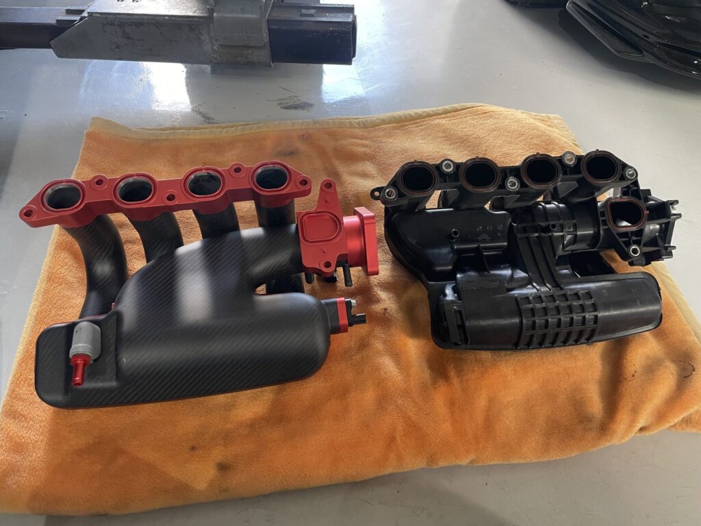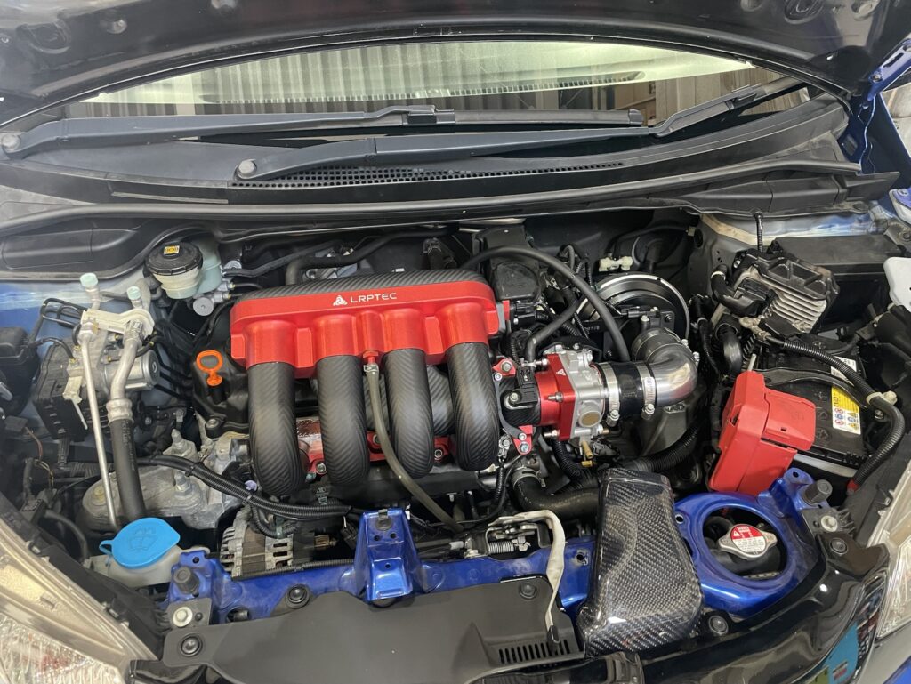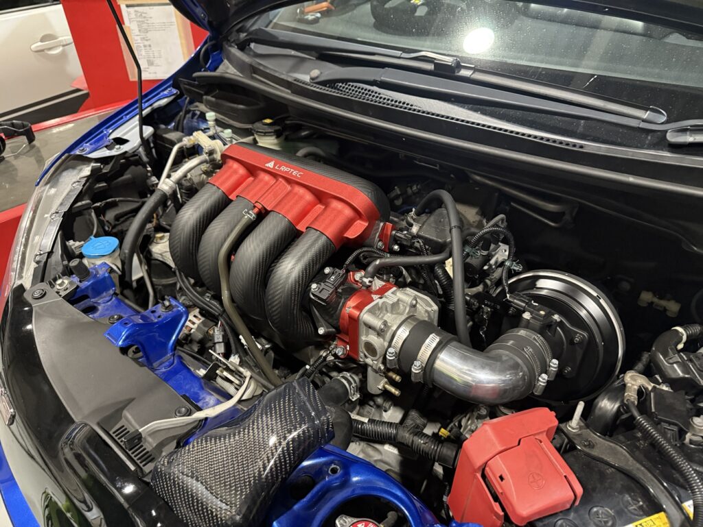 今回GK5(フィット)の現車セッティングのご依頼があり、海外のレースで使われていた高効率のカーボンインテークマニホールドを使用させていただきました。
