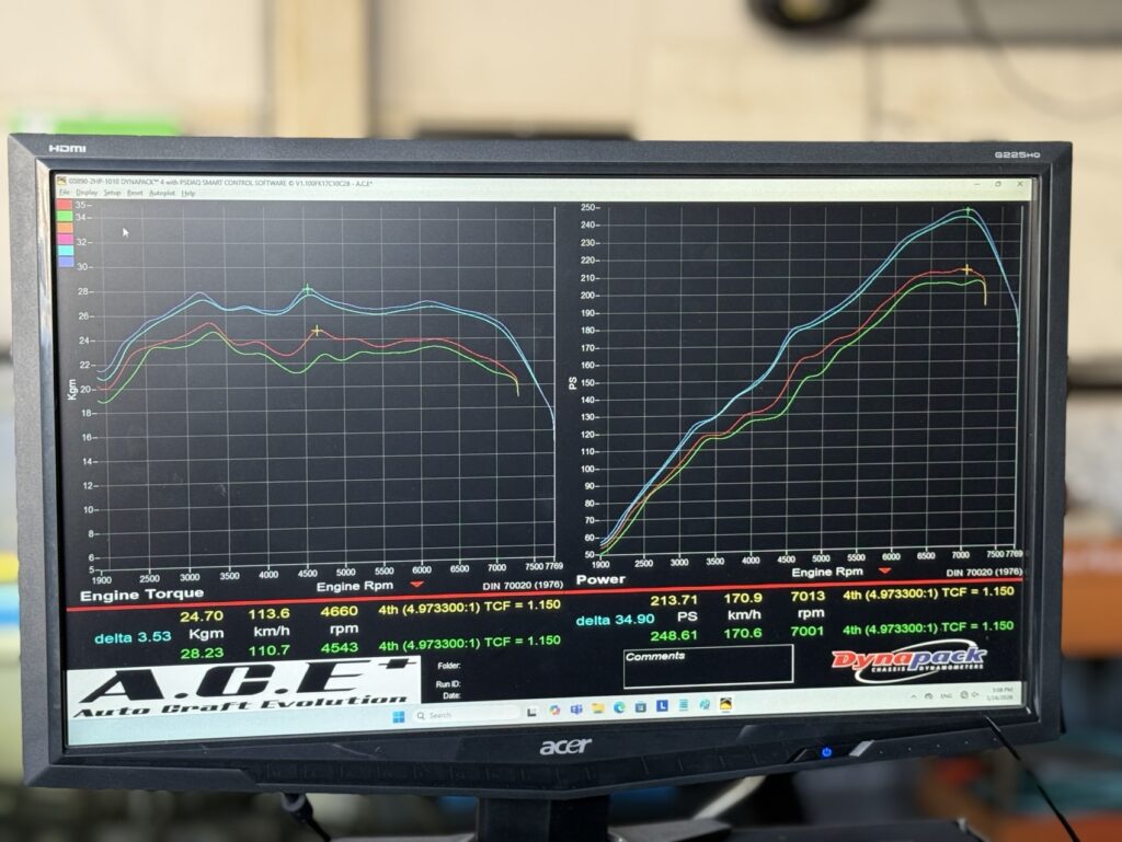 という事で通常通り点検作業から行い、ダイナパックにてノーマルecu状態で現状エキマニやマフラーは装着されてますが、2回ほどセッティング前に計測。